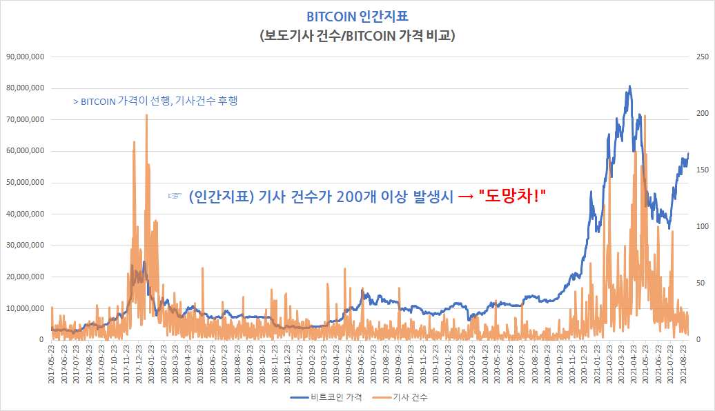 비트코인가격을 비트코인 신문/방송기사 건수 데이터 비교